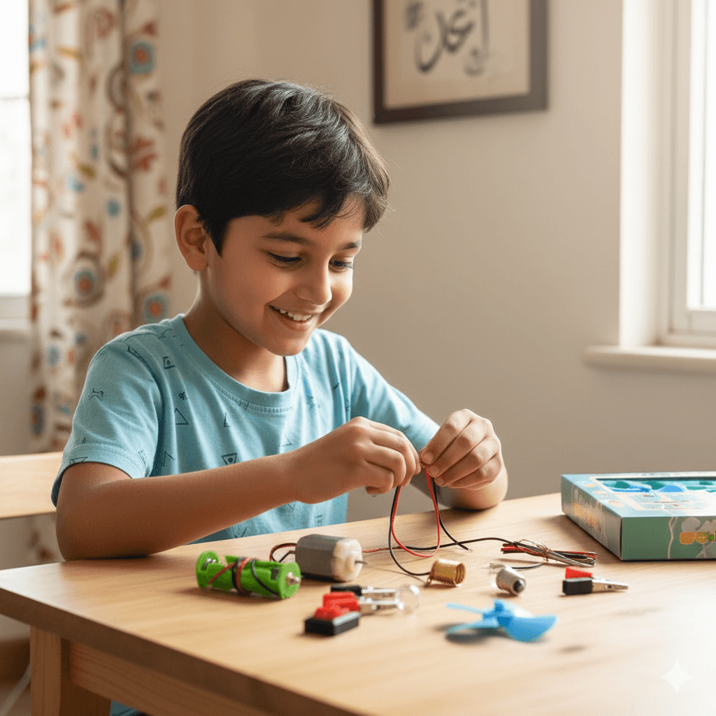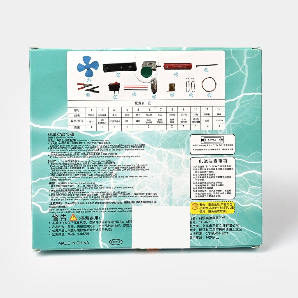 This educational set includes everything your child needs to create simple projects such as a mini fan, glowing bulb, and switch-controlled circuits. By experimenting with the included motor, propeller, light bulb, and wires, children can see how electricity flows and powers different devices.
